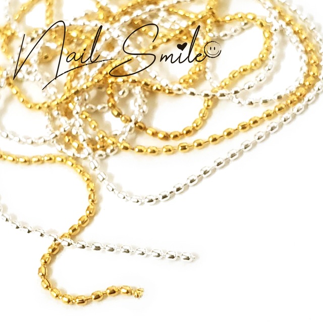 囲みやポイントにもお使い頂けます。カットも簡単に出来るチェーンパーツです。 【内容量】1本 【サイズ】約0.8mm(長さ約80cm) ※人工カットのためサイズは多少の誤差が生じる場合が御座います。予めご了承くださいませ。 ネイル パーツ チェーン ハンドメイド 囲みネイル アクセサリー ボールチェーン 楕円